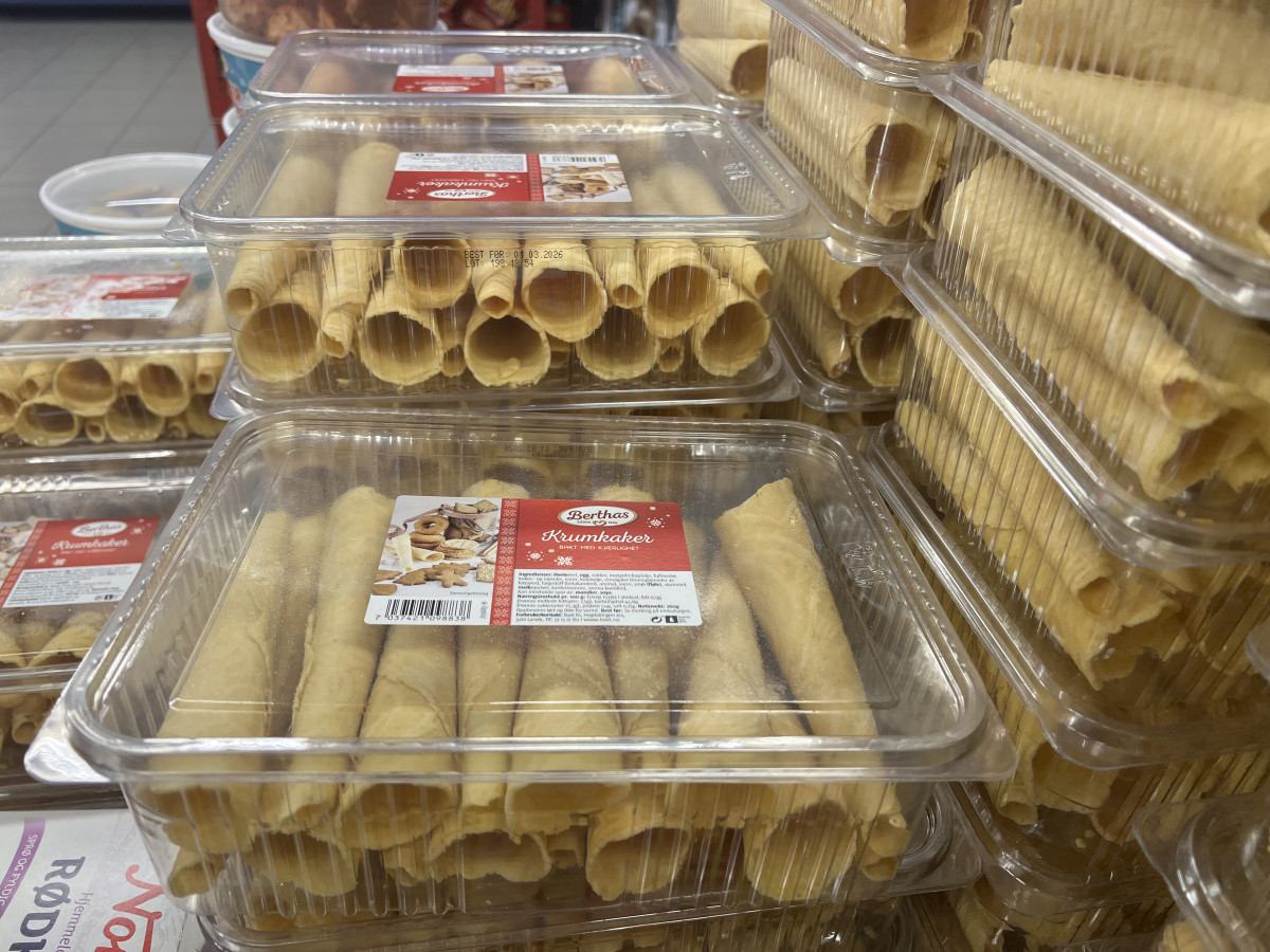 Alapvetően hétféle süteményt (syv slag) sütnek az ünnepekre. Kiemelkedik a peperkake, vékony gyömbéres-fahéjas mézeskalács, amely boltokban kész és félkész állapotban is kapható. Emellett ott van a fagylalttölcsérre emlékeztető krumkake, amit tejszínhabbal és lekvárral tálalnak. A sandkaker és serinakaker vajas alapú omlós kosárka és cukros keksz, míg a berlinerkranser, azaz berlini koszorú tésztája különösen omlós, jégcukorral díszítve. Végül a goro és a fattigmann: előbbi mintás ostya és keksz keveréke, utóbbi kardamom hozzáadásával fánkszerű édesség, leginkább a csörögéhez hasonló, neve magyarul „szegény ember”.