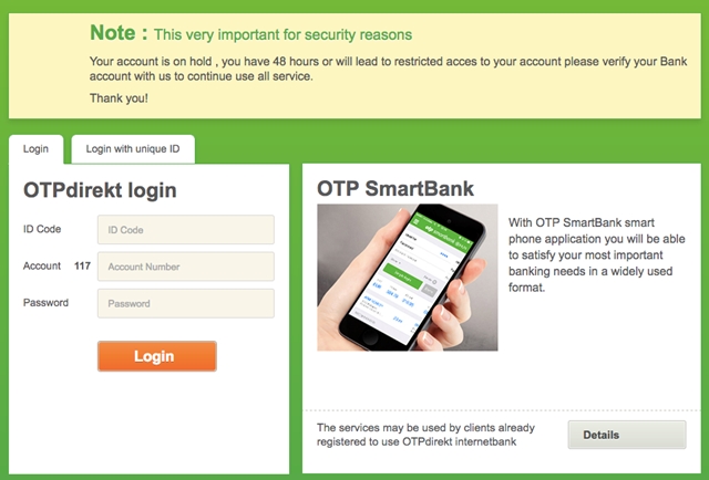 Az üzenetben van egy link, ami látszólag a valódi OTP-oldalra visz, de ha rákattintunk, egy kamuoldalra jutunk. Ott az szerepel, hogy ha 48 órán belül nem írja be a felhasználó az adatait, zárolják a számláját. Ez nem igaz.
