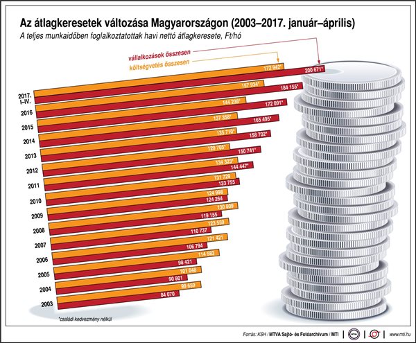 Az átlagkeresetek változása Magyarországon (2003-2017. január-április).