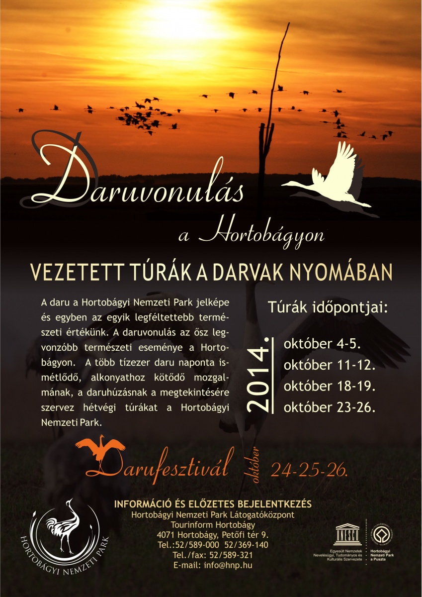 A daru a Hortobágyi Nemzeti Park jelképe, a daruvonulás pedig az ősz legvonzóbb természeti eseménye a Hortobágyon. Néprajzi és tudományos ismeretterjesztő előadásokkal, zene- és táncbemutatóval, táncházzal, kézműves foglalkozásokkal, hagyományos ételkóstolóval, hajnali, táplálkozó és az esti darulessel fogadjuk az érdeklődőket, a darules után csillagászati bemutatóval.