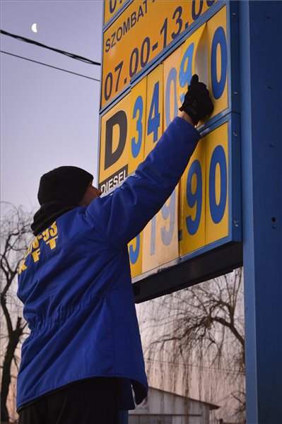 Egy kútkezelő kicseréli a számokat a Délfu 93 Kft. benzinkútjának hirdetőoszlopán Debrecenben 2015. január 14-én. Ezen a napon bruttó 5-5 forinttal csökkenti a 95-ös benzin és a gázolaj literenkénti nagykereskedelmi árát a Mol Nyrt. A csökkentéssel a 95-ös benzin literenkénti átlagára 325-326 forintra, a gázolajé 347-348 forintra mérséklődött. MTI, fotó: Czeglédi Zsolt