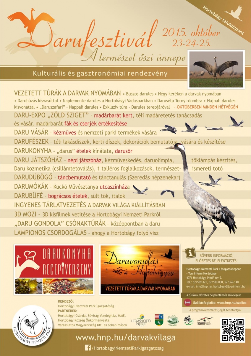 A Hortobágyi Nemzeti Park Igazgatóság október hónapban rendszeresen szervez túrákat és előadásokat a darvak életének megismerésére, a madarak szabad természetben történő megfigyelésére. Október 23-25-ig rendezik meg a Darufesztivált, mely a természet őszi ünnepe.