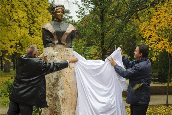 Szilvássy Zoltán, a Debreceni Egyetem rektora (b) és Habsburg György rendkívüli és meghatalmazott európai uniós nagykövet leleplezik Auguszta Mária Lujza bajor hercegnő, osztrák főhercegné, magyar királyi hercegné szobrát az egyetem Klinikai Központ Auguszta épülete előtt Debrecenben 2015. október 20-án. A szobrot Gáspár Géza szobrászművész készítette. MTI Fotó: Czeglédi Zsolt