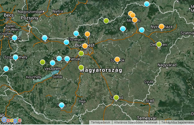 Ajkát, Dunaújvárost, Százhalombattát, Szegedet, Salgótarjánt és Debrecent a kifogásolt levegőminőséget jelző zöld színnel jelölték.