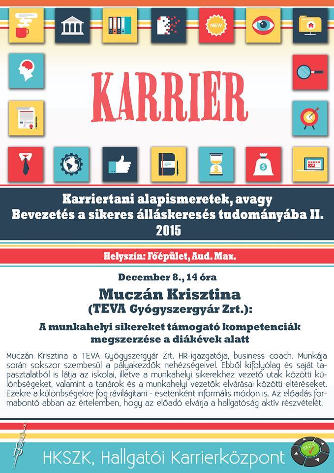 A Karrierközpont idei utolsó előadásán Muczán Krisztina, a TEVA Gyógyszergyár Zrt. országos HR-igazgatója, business coach tart előadást.