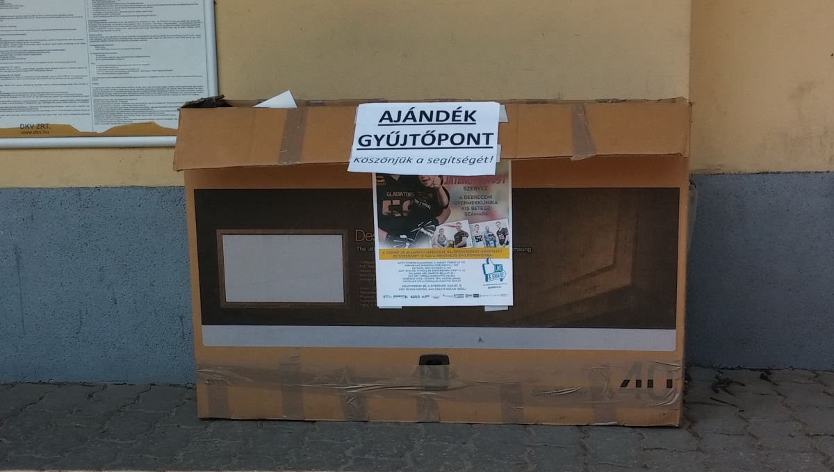 Egy kiszuperált televíziós kartondoboz, belsejébe szigetelőszalaggal odaerősített fekete szemeteszsákok. Ez virít a DKV jegypénztára előtt a debreceni vasútállomásnál. Első ránézésre azt hittem, a szelektív hulladékgyűjtő mellől sodorta oda a szél, és átmeneti szemetesként funkcionál a még annak sem túl esztétikus képződmény. Közelebb menve láttam, hogy nem: ebbe a dobozba beteg gyerekeknek szánt adományokat várnak…