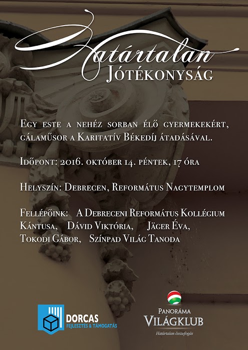 2016. október 14-én (pénteken) 17 órától rendezik a Dorcas Aid Alapítvány és a Hajdú-Bihar Megyei Panoráma Világklub szervezésében a Határtalan Jótékonyság című gálaműsort a Debreceni Református Nagytemplomban.