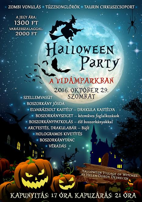 2016. október 29-én, szombaton, egy varázslatos éjszakán, ebben az évben utoljára nyitja ki kapuit a Vidámpark. 17-21 óra között egyedülálló, színes programkavalkáddal várják egy Halloween estére mindazokat, akik különleges szórakozásra vágynak.