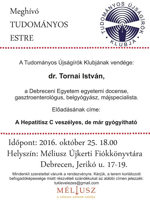 A betegségről, szövődményeiről, megelőzéséről, szűréséről és gyógyításáról Dr. Tornai Istán, a Debreceni Egyetem II. Számú belklinikájának májspecialistája tart felvilágosító előadást 2016. Október 25-én 18 órától az Újkerti Könyvtárban. / Jerikó u.17-19./ Az rendezvény nyilvános és ingyenes.