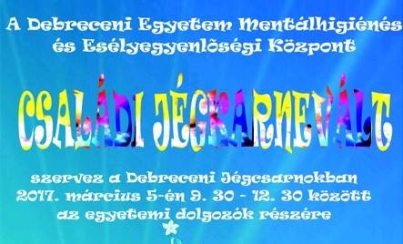 A Debreceni Egyetem Mentálhigiénés és Esélyegyenlőségi Központ és a Lelkierő Egyesület Családi Jégkarnevált szervez a Debreceni Jégcsarnokban 2017. március 5-én (vasárnap) 9:30-12:30 között a Debreceni Egyetem dolgozói számára.