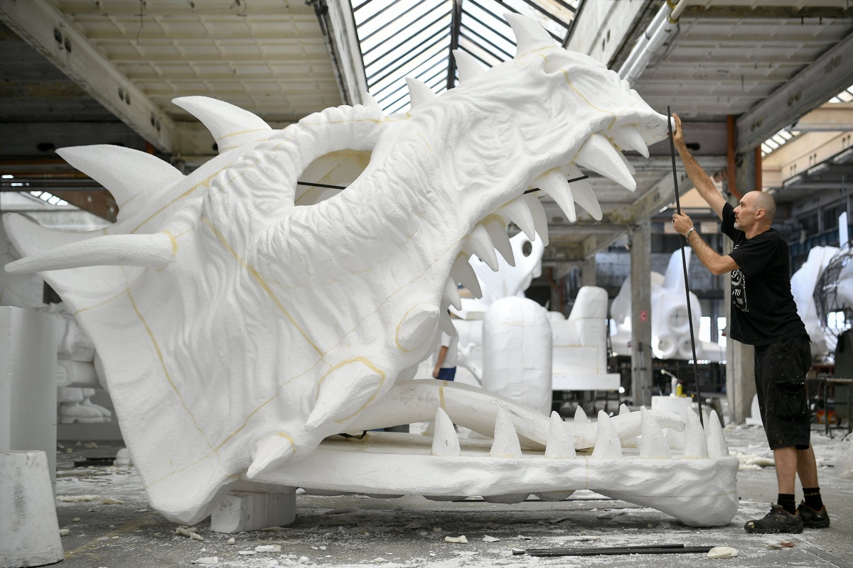 Hungarocellfigurát alakítanak egy virágkarneváli kocsihoz Debrecenben 2017. augusztus 9-én. Az augusztus 20-i karneváli menetben tizennégy virágkocsi vonul fel.