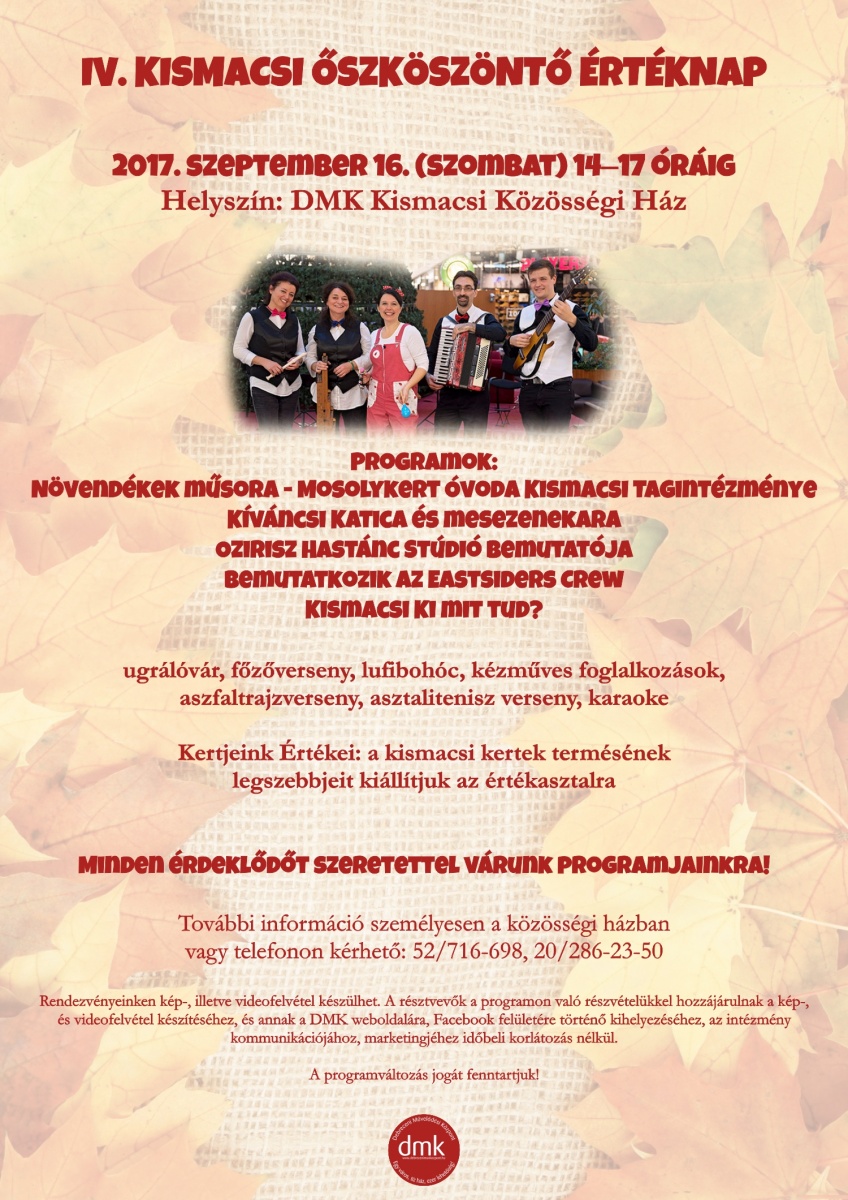 Szeptember 16-án, szombaton, 14–17 óráig immár negyedik alkalommal szervezik meg a Kismacsi Őszköszöntő Értéknapot a Debreceni Művelődési Központ Kismacsi Közösségi Házában (Debrecen – Kismacs, Napraforgó u. 16.). Az értékasztalra kiállítják a kismacsi kertek terméseinek legjavát. Műsort adnak a Mosolykert Óvoda Kismacsi Tagintézményének növendékei, a  Kíváncsi Katica és mesezenekara, az Ozirisz Hastánc Stúdió, és az Eastsiders Crew.