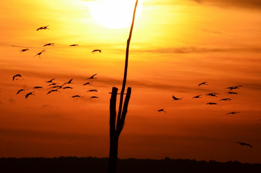 Több tízezer daru tölti az éjszakát a Kondás-tó lecsapolt medrében, majd napfelkelte után elindul táplálkozó helyeire. Először kisebb, majd egyre nagyobb csapatokban repülnek ki, amely gyönyörű látvány háttérben a napfelkeltével.