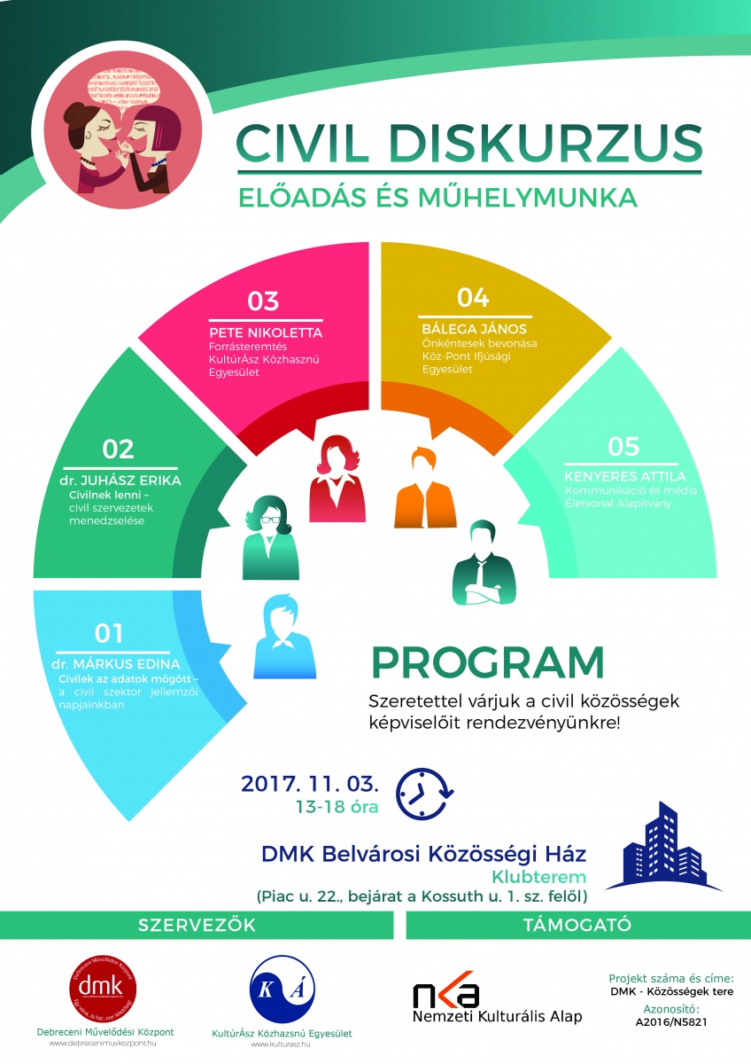 A Debreceni Művelődési Központ a Nemzeti Kulturális Alaptól támogatást nyert a „DMK – A közösségek tere” címmel. A projekt megvalósításának egyik eleme a „Civil diskurzus”, amely november 3-án, pénteken, 13 órakor kezdődik a Debreceni Művelődési Központ Belvárosi Közösségi Házában (Pódiumterem, Piac u. 22., bejárat a Kossuth u. 1. szám felől).