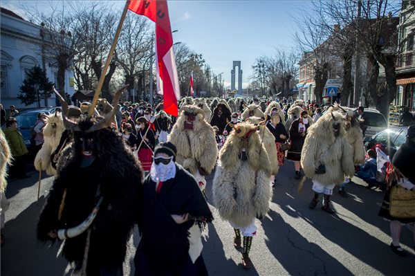 A Duna-parti város főterén kedden több ezer látogató gyűlt össze, hogy a borzas busóbundába öltözött, faragott álarcokat viselő hagyományőrzőkkel együtt kereplők, kolompok zajára elbúcsúztassa a telet.