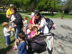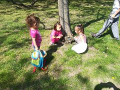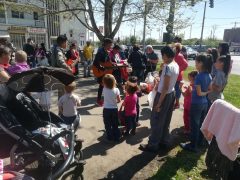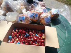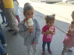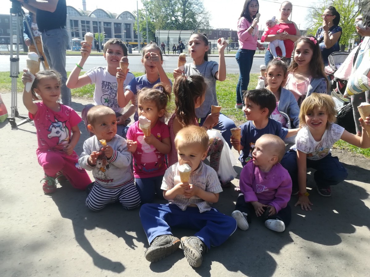 A nyuszi is kilátogatott az ételosztás helyszínére, egy kis ajándékkal tudtunk kedveskedni a szüleikkel érkező gyermekeknek. Nagy sikere volt a tojáskeresőnek, a gyerekek jókedvvel futottak a tér fái körül, s harsány kiáltással fogadták, mikor megtalálták a “zsákmányt”. Igazi meglepetésként az összes gyermek az ételen kívül a vendégünk volt 2-2 gombócos fagyira. Kis arcuk ragyogott, vidáman majszolták az édességet, legtöbbjük ebben az évben először evett fagyit. Aki nem látta, nem is tudja elképzelni, milyen szívet melengető érzés volt látni a gyerkőcöket a fagyival “birkózva”, többünk szeme bizony furcsán csillogott. Nincs annál jobb érzés, mikor 5-6 éves gyerekek átölelnek bennünket, és azt mondják: “szeretlek”. Ilyenkor úgy érezzük, hogy a kegyetlen világunkban milyen fontos, ha az ember – ha egy picinykét is–segíteni tud embertársain.