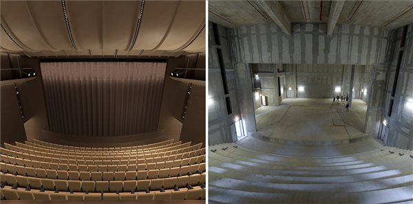 A kombóképen jobbról az épülő debreceni Latinovits Színház belső tere 2019. június 3-án, balról a debreceni önkormányzat által ezen a napon közreadott belsőépítészeti látványterv. Befejeződhet a Latinovits Színház évekkel korábban félbe maradt építése, miután az ezzel kapcsolatos részletes pályázatot is elfogadta a Románia-Magyarország határ menti együttműködési program ellenőrző bizottsága és megítélte a támogatást a munkák elvégzéséhez. MTI/Debreceni önkormányzat/Tisza Építész Műterem Kft./Czeglédi Zsolt