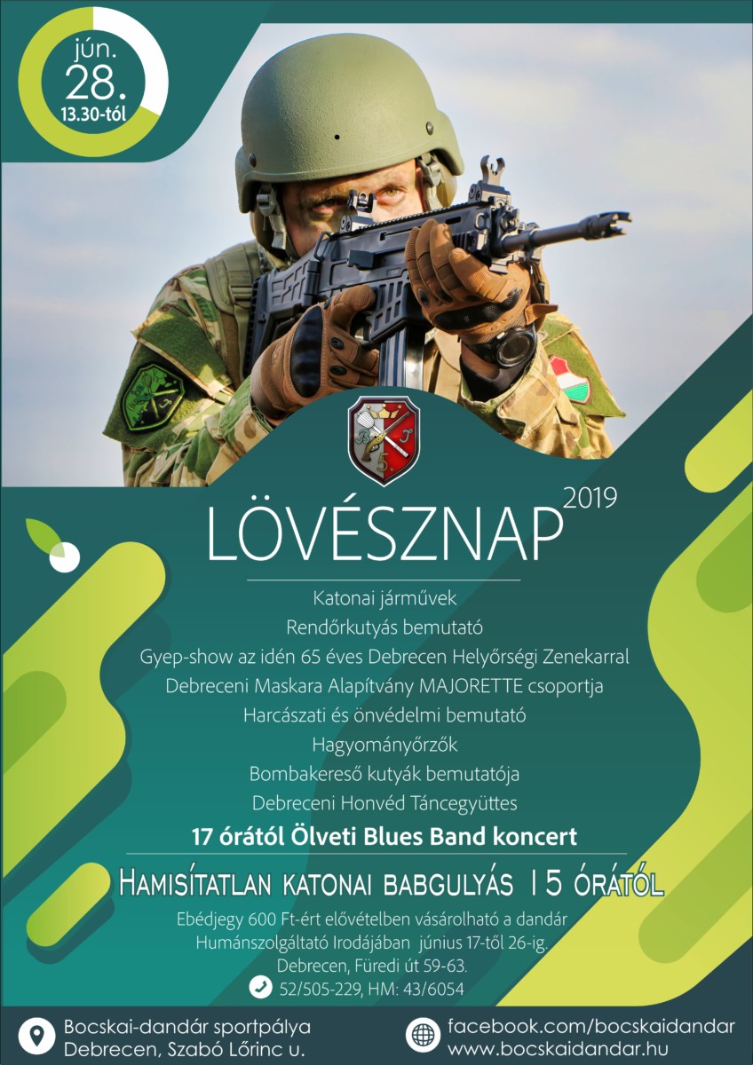 Az MH 5. Bocskai István Lövészdandár június 28-án 13.30-tól tartja lövésznapi rendezvényét a dandár sportpályáján, a Szabó Lőrinc utcán. A péntek délutáni eseményre színes programokkal készül az alakulat. A katonai járművek, felszerelések , a harcászati bemutató, a hagyományőrzők és a katonazenekar természetesen idén sem hiányozhat.