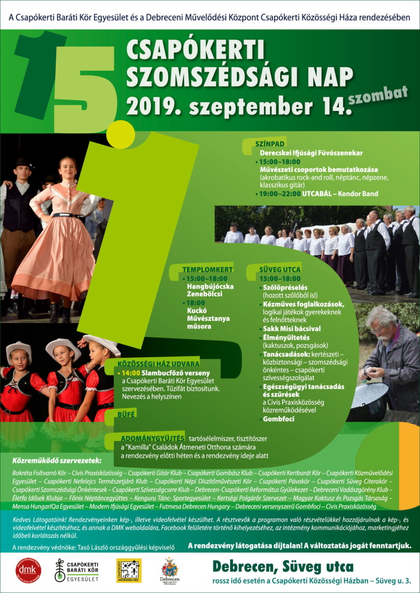 A Debreceni Művelődési Központ Csapókerti Közösségi Háza és a Csapókerti Baráti Kör Egyesület 2019. szeptember 14-én, szombaton, 15 órakor immár 15. alkalommal rendezi meg a Csapókerti Szomszédsági Napot a Süveg utcán.