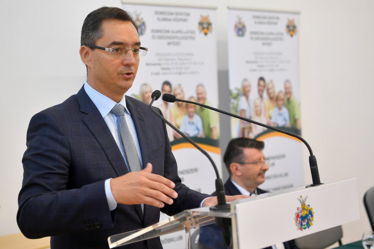 Papp László polgármester beszédet mond Debrecenben, a Pósa utcában, az Iskola-egészségügyi Ellátási Központ és Egészségfejlesztési Iroda új épületének átadásán 2019. október 11-én.