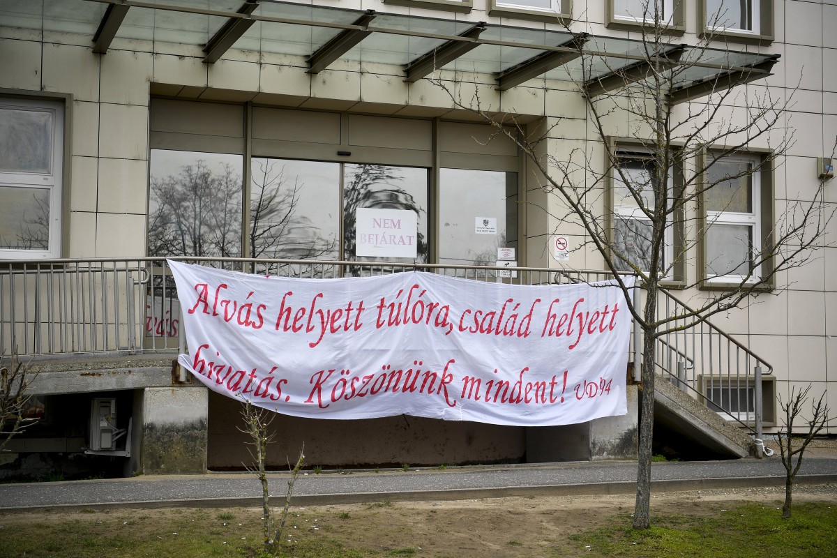 Alvás helyett túlóra, család helyett hivatás. Köszönünk mindent! feliratú molinó a Debreceni Egyetem Kenézy Gyula Egyetemi Kórház korlátján Debrecenben 2020. március 21-én. A molinót a debreceni szurkolói csoport, a Szívtiprók Ultras Debrecen 1994 (SZUD) tagjai helyezték ki, köszönetet mondva a koronavírus-járvány elleni küzdelemben részt vevő egészségügyi dolgozóknak. MTI/Czeglédi ZsoltEgy világ terhe rajtatok, egy ország hálája mögöttetek feliratú molinó a Debreceni Egyetem Klinikai Központjának kerítésén Debrecenben 2020. március 21-én. A molinót a debreceni szurkolói csoport, a Szívtiprók Ultras Debrecen 1994 (SZUD) tagjai helyezték ki, köszönetet mondva a koronavírus-járvány elleni küzdelemben részt vevő egészségügyi dolgozóknak. MTI/Czeglédi Zsolt