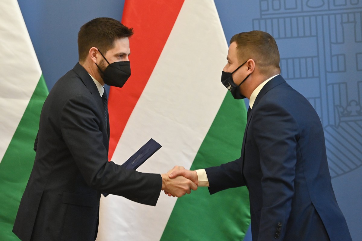Magyar Levente, a külgazdasági és külügyminisztérium parlamenti államtitkára átadja a támogatási szerződést Kiss Attilának, a Nagyhegyesi Takarmány Kft. ügyvezető igazgatójának a Dolcetta Kft., a MAM-Hungária Kft. és a Nagyhegyesi Takarmány Kft. támogatásáról szóló szerződések ünnepélyes átadásán a Külgazdasági és Külügyminisztériumban 2021. január 14-én. MTI/Illyés Tibor