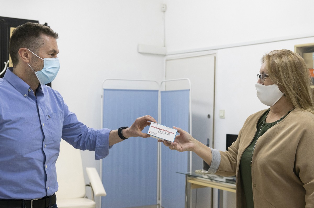 Gulyás Gábor háziorvos átveszi az amerikai Moderna cég koronavírus elleni oltóanyagát Szabó Tünde megyei tisztifőorvostól a Szabolcs-Szatmár-Bereg Megyei Kormányhivatal Népegészségügyi Főosztályának épületében Nyíregyházán 2021. február 3-án.