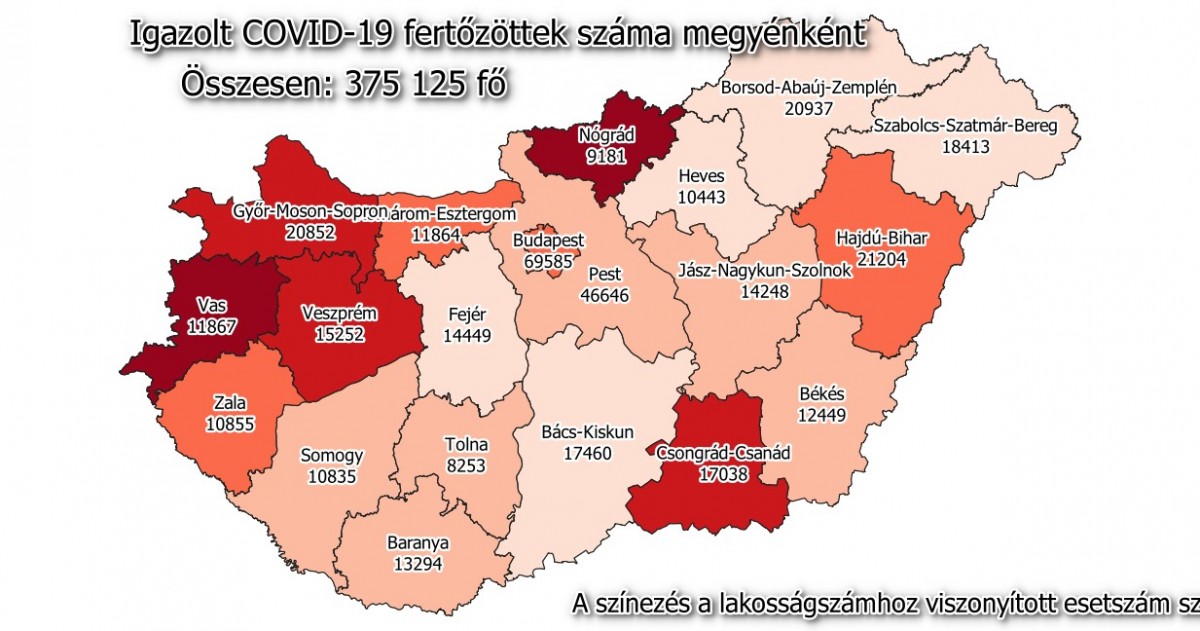 1561 újabb magyar állampolgárnál mutatták ki az új koronavírus-fertőzést, ezzel 375 125 főre nőtt a hazánkban beazonosított fertőzöttek száma. Elhunyt 96 többségében idős, krónikus beteg, így az elhunytak száma 13 026 főre emelkedett. A gyógyultak száma is folyamatosan nő, jelenleg 277 949 fő, az aktív fertőzöttek száma 84 150 főre csökkent. 3601 koronavírusos beteget ápolnak kórházban, közülük 298-an vannak lélegeztetőgépen.