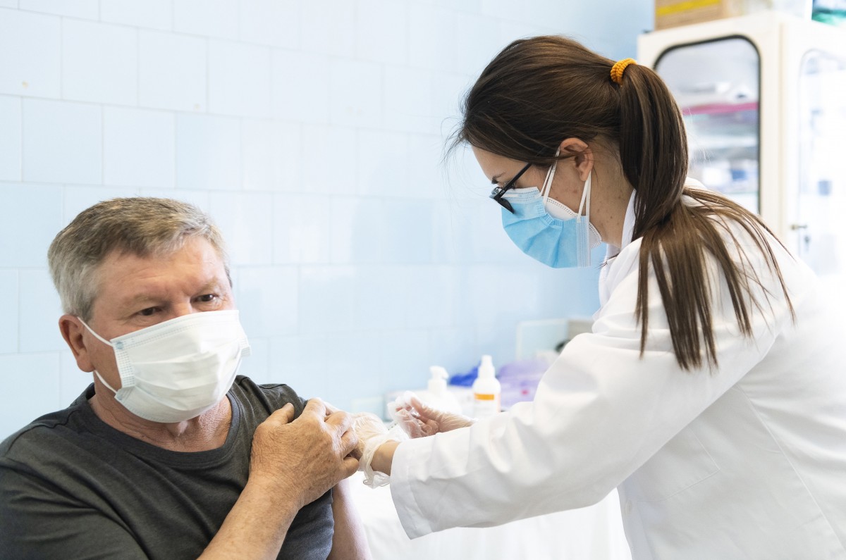 Az MTI fotójá láthatjuk, hogy Csehely Csilla bőrgyógyász beolt egy férfit a német-amerikai fejlesztésű Pfizer-BioNTech koronavírus elleni oltóanyag, a Comirnaty-vakcina második adagjával Nyíregyházán, a Jósa András Oktatókórházban kialakított oltóponton 2021. április 25-én vasárnap.