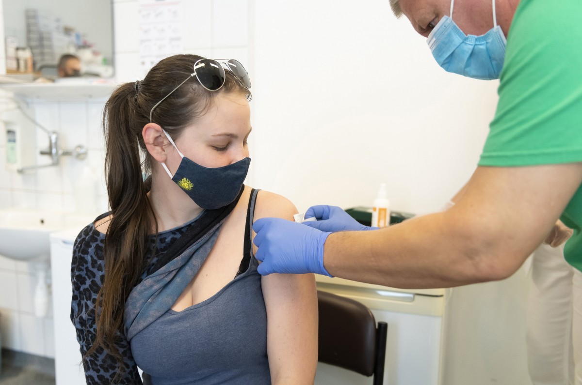 Tóth László ortopéd főorvos leragasztja egy nő karját, miután beoltotta a kínai Sinopharm koronavírus elleni vakcina második adagjával a nyíregyházi Jósa András Oktatókórházban kialakított oltóponton 2021. május 24-én.