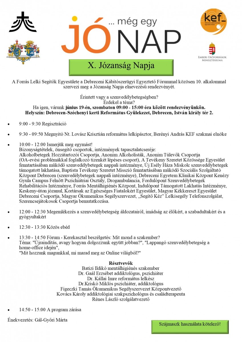 A 2001-ben alakult Debreceni Kábítószerügyi Egyeztető Fórum és a 31 éve működő Forrás Lelki Segítők Egyesülete közösen szervezi meg X. alkalommal a Józanság Napja elnevezésű rendezvényt, Debrecenben 2021. június 19 – én.