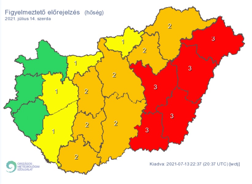 A hőség miatt a keleti megyékre piros (harmadfokú) veszélyjelzést adtak ki, a zivatarveszély miatt a középső megyékre narancssárga (másodfokú), Hajdú-Biharra és a többi megyére elsőfokú figyelmeztetést adtak ki: