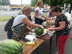 A “hivatalos” kezdés előtt egy háromnegyed órával már közel százan álltak a Petőfi tér fái között, és várták, hogy a gazdag választékból válogassanak, megtöltsék dobozaikat, szatraikat. Az “parti” étlapján kétféle főétel, kenyér, péksütemény, dinnye, joghurt szerepelt.