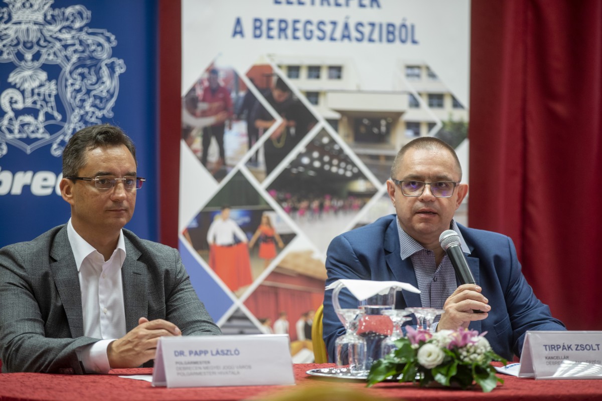 A tanítási nap kezdési időpontjának újabb debreceni iskolában való változásáról tartott sajtótájékoztatót Papp László polgármester és Tirpák Zsolt, a Debreceni Szakképzési Centrum (DSZC) kancellárja 2021. augusztus 31-én.