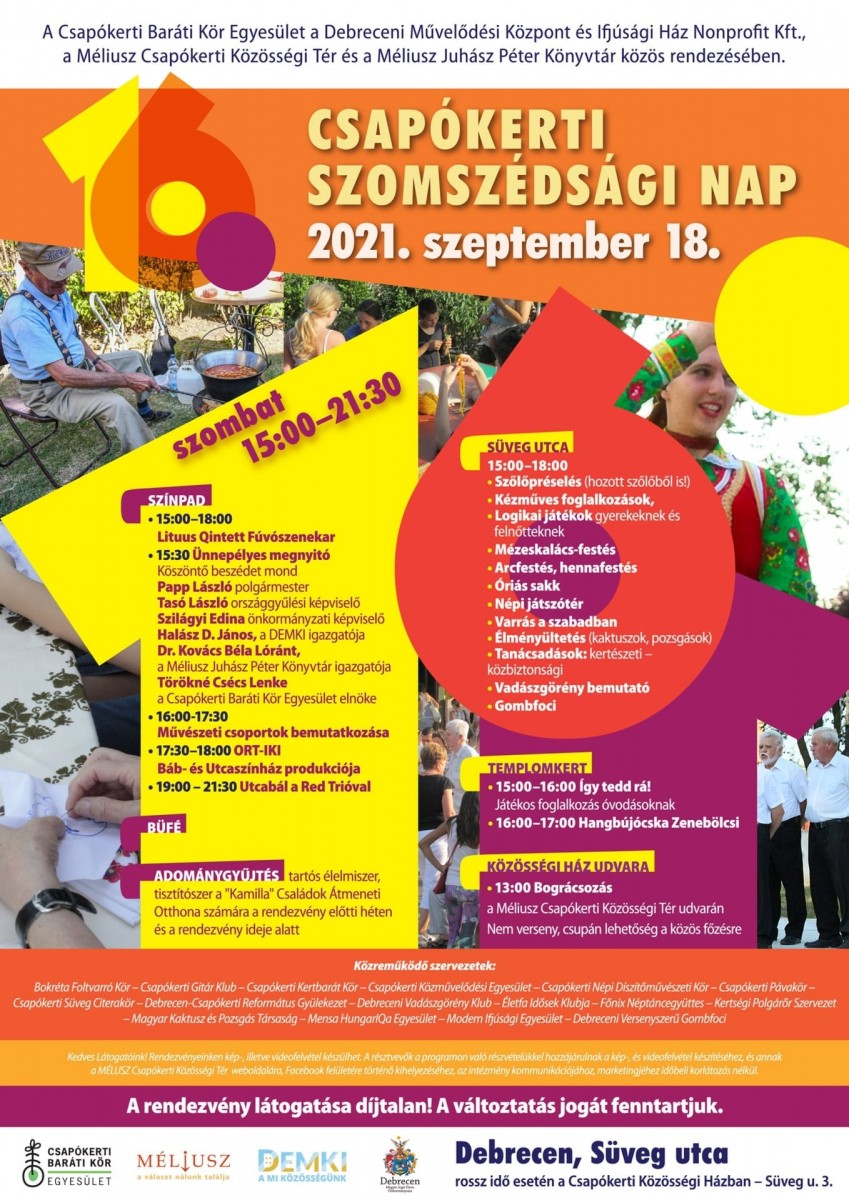 Szeptember 18-án, szombaton rendezik a Csapókerti Szomszédsági Napot. Az eseményt Papp László polgármester nyitja meg 15:30-kor.Részletes programajánló: