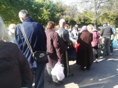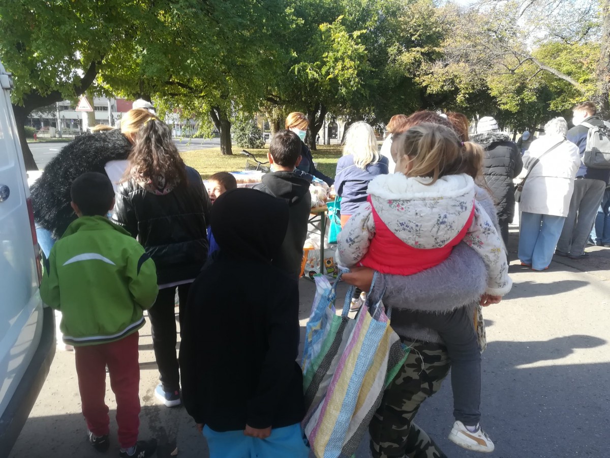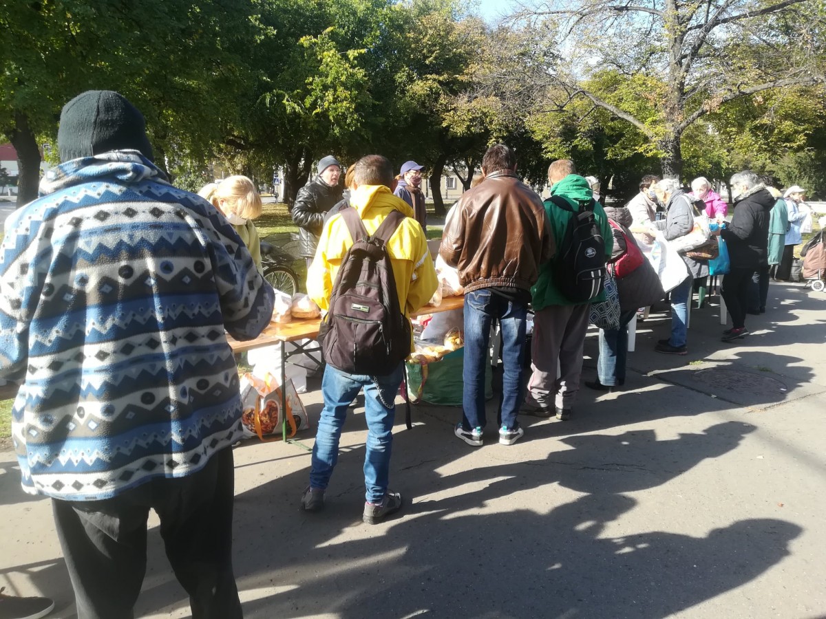 A kellemes, napos időben már a kezdés előtt másfél órával elkezdtek gyülekezni a Petőfi téren az ételre várók. Folyamatosan jöttek, többségében kisnyugdíjasok és gyermekes családok.