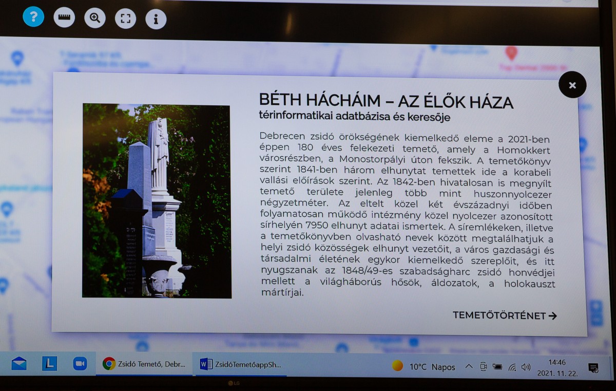 Az applikáció letöltése után nevekre is rá lehet keresni, de virtuálisan is bejárható a Monostorpályi úti temető. A szakember felidézte, hogy 1840-ben kaptak a zsidók letelepedési engedélyt Debrecenben, és 1841-ben temettek először a sírkertbe. A feltáró munkák során nyolcezer sírt azonosítottak, felkutatva a sírban fekvők adatait is. Mintegy háromszáz olyan sír van a temetőben, amely mára annyira megrongálódott, hogy azonosítása nem lehetséges, vagy hosszú, más típusú kutatással lehet esetleg eredményes – tette hozzá.