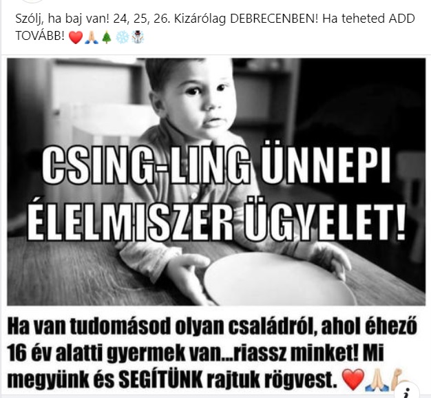 Az aktivisták olyan éhező, 16 éven aluli gyermekkel rendelkező DEBRECENI családok jelentkezését várják, ahol jól jön egy kis segítség az ünnepek alatt.