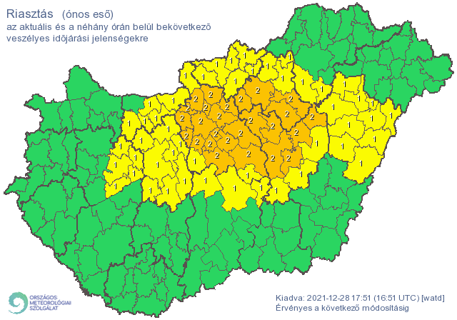 Az MTI-hez eljuttatott veszélyjelzésük szerint Budapestre, valamint Pest, Heves, Jász-Nagykun-Szolnok és Nógrád megye több járására adták ki a másodfokú riasztást. Ezeken a területeken a következő órákban tartós ónos eső várható.