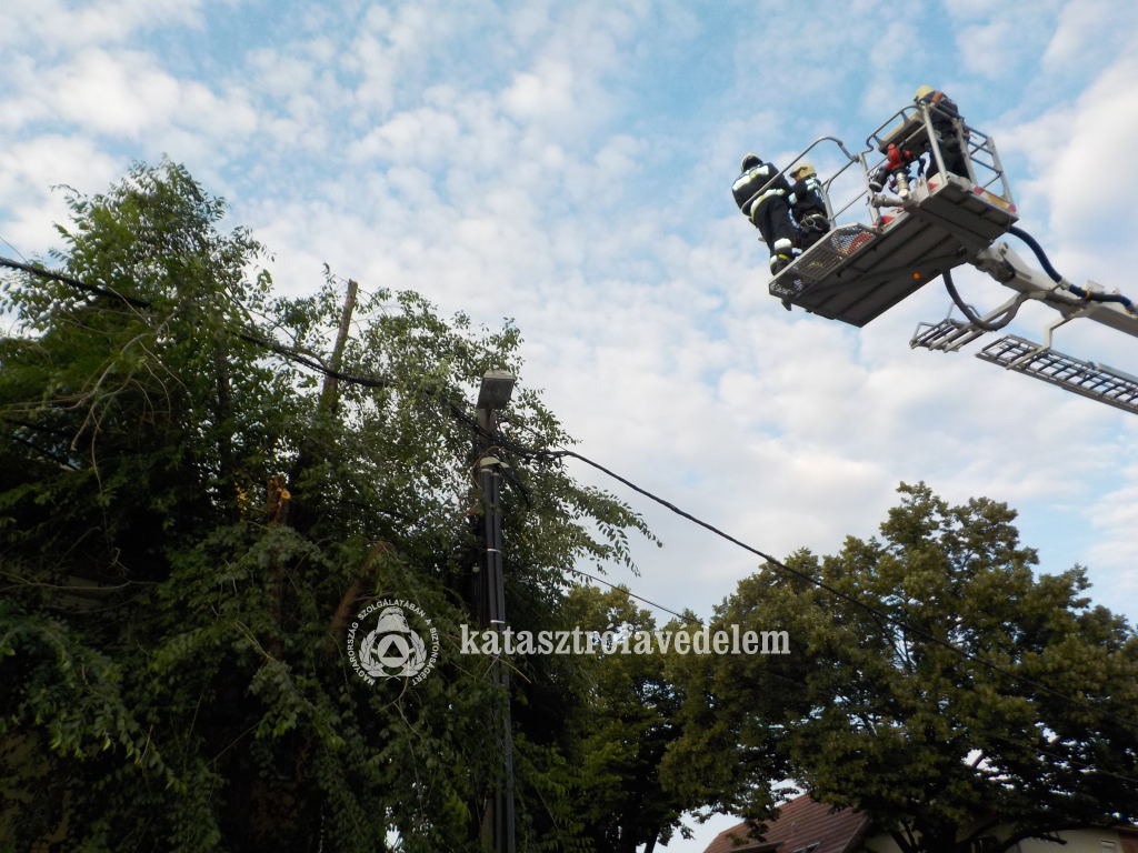 A létavértesi önkormányzati és konyári önkéntes tűzoltók motoros láncfűrésszel levágták az ágat.