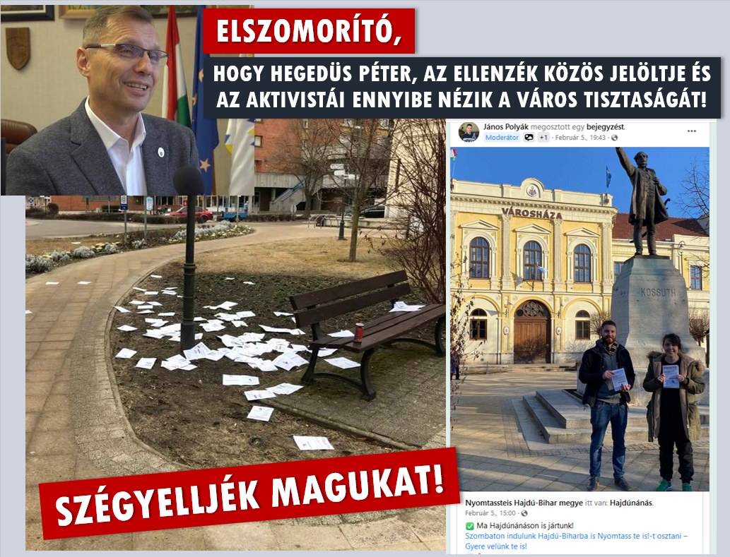 Elszomorító,hogy Hegedüs Péter, az ellenzék közös jelöltje ésaz aktivistái ennyibe nézik a város tisztaságát!SZÉGYELLJÉK MAGUKAT!