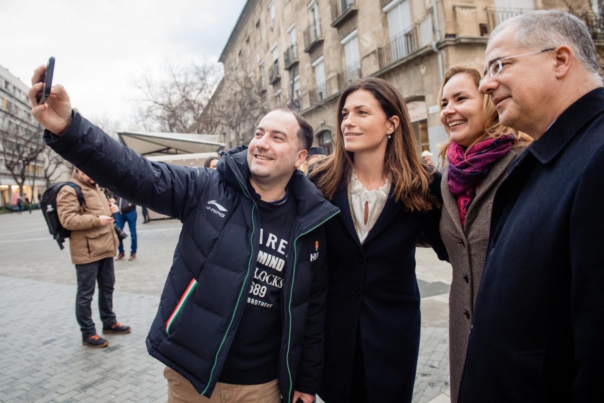 A Dósa nádor téren gyűlt össze a fogadóbizottság, az aláírásgyűjtés közben látványos szelfik is készültek: