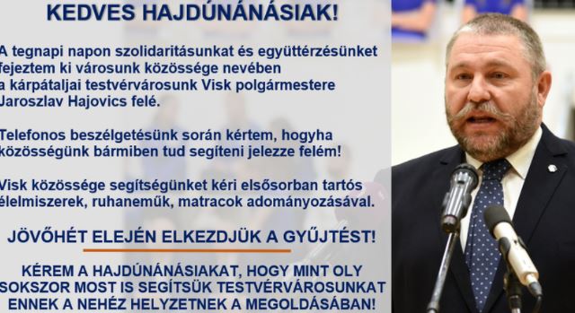Kárpátaljai testvérvárosának fejezte ki együttérzését Szólláth Tibor, Hajdúnánás polgármestere. Visk polgármesterével, Jaroszlav Hajoviccsal folytatott telefonos beszélgetés során kiderült, hogy mivel lehetne segíteni a közösséget.
