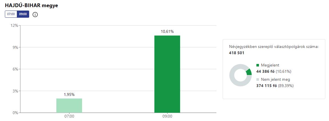 A részvételi adatok első összesítése szerint 7 óráig a névjegyzékben szereplő választásra jogosultak 1,82 százaléka (139 667 választó) jelent meg az urnák előtt. Az országos átlagnál Hajdú-Bihar megyében magasabb volt az érdeklődők aránya.