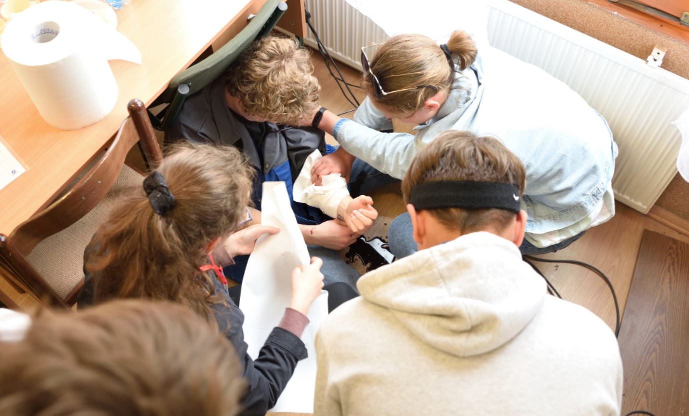 Összesen 3 kárhely és 2 elméleti állomás várta a csapatokat; életszerű helyzetekben kötöztek a fiatalok artériás, vénás vérzést, kezeltek áramütést szenvedett, gerincsérültet, elláttak félrenyelést, infarktusos beteget is.