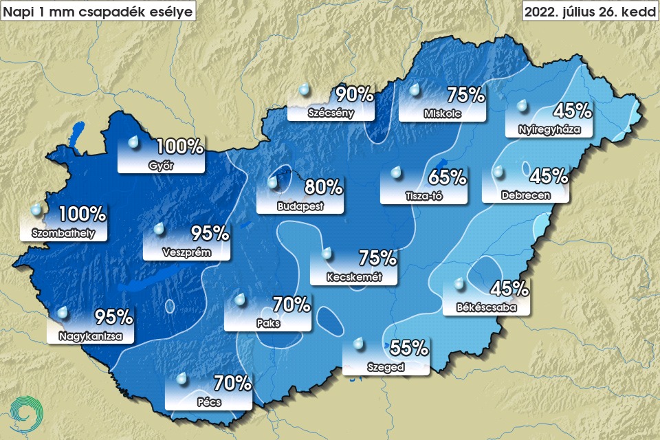 Mennyiség szempontjából nem a súlyos aszályos területek kapják a legtöbb csapadékot, hanem a nyugati megyékben várható nagyobb számban zápor, zivatar, ott akár 10 mm fölötti csapadékösszegek is elképzelhetők, de lokálisan ennél többet sem lehet kizárni. Megélénkül, a front mentén meg is erősödik az északnyugati szél, zivataroknál pedig viharos lökések is lehetnek átmenetileg