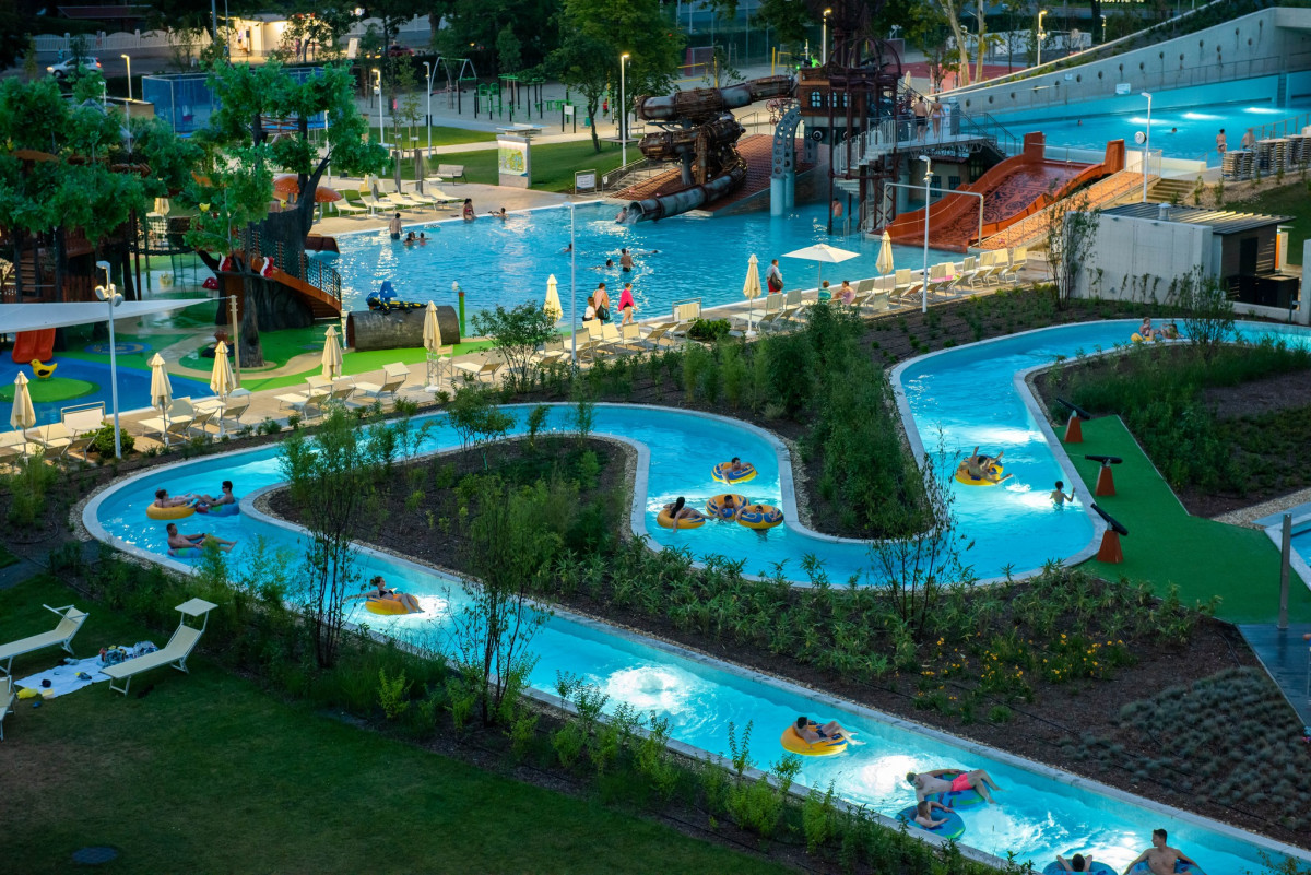 A hangulatot fokozzák az óriáscsúszdák, a kalandmedencék, az ugróplatform és fölötte 12 méter magasan épített, üvegaljú medence.