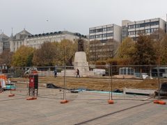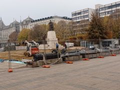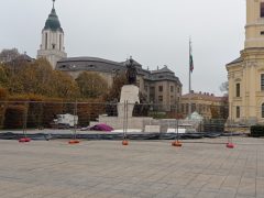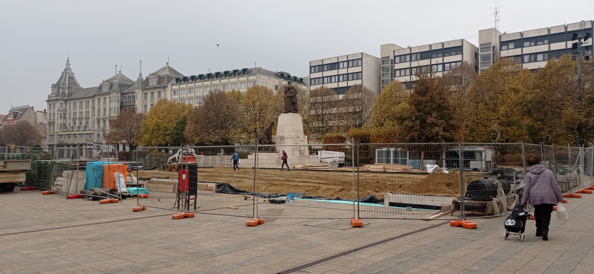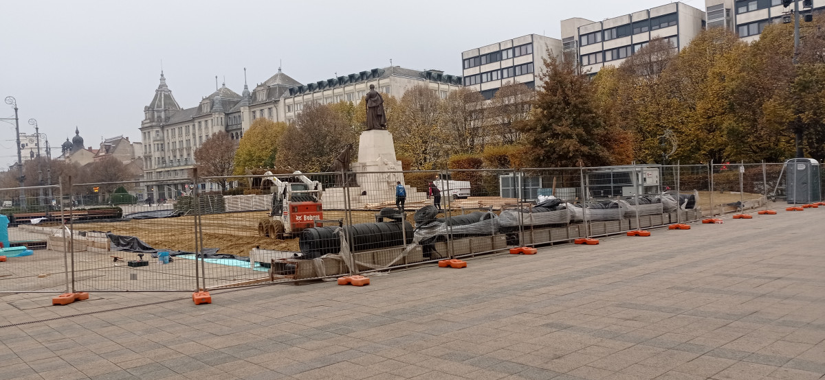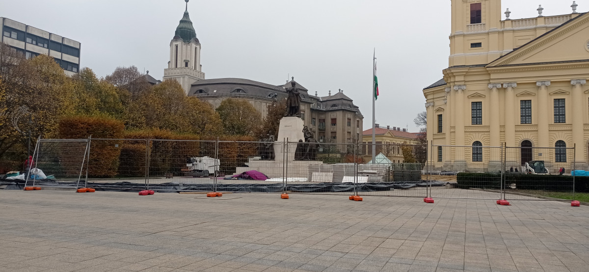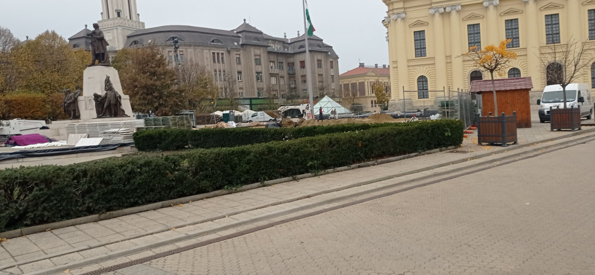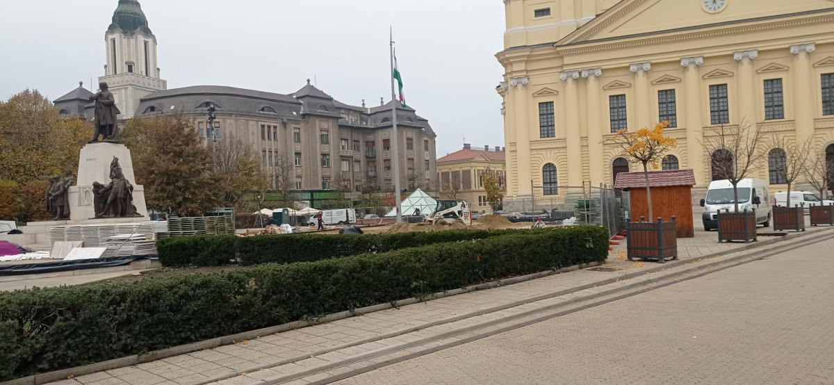 Adventhez közeledvén még nem áraszt ünnepi hangulatot a Piac utca és a Kossuth tér, sőt utóbbié leginkább egy építési területhez hasonít a kordonokkal. Megvan az oka ennek is, hiszen itt kezdték el kialakítani az ilyenkor szokásos műjégpályát, habár ezzel együtt az energetikai megszorítások részeként a két jégcsarnok is be fog zárni, a Nagyerdei Stadionnál pedig egyáltalán nem lesz korcsolyázásra alkalmas helyünk. Ott jártunkkor éppen egy markoló dolgozott a helyszínen, és terítette a homokot, vélhetően a pálya alapjának kialakítása érdekében. Ha elkészül, bizonyosan nagyon népszerű lesz majd a jeges sportok kedvelőinek körében.