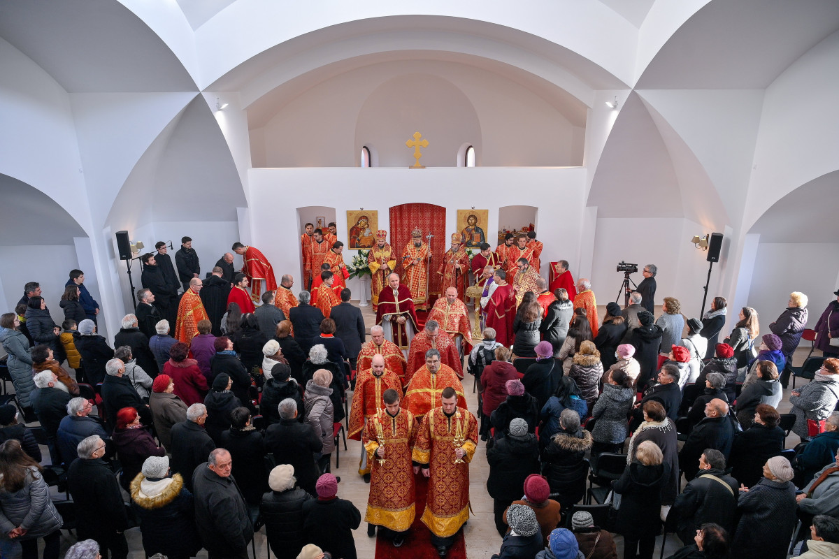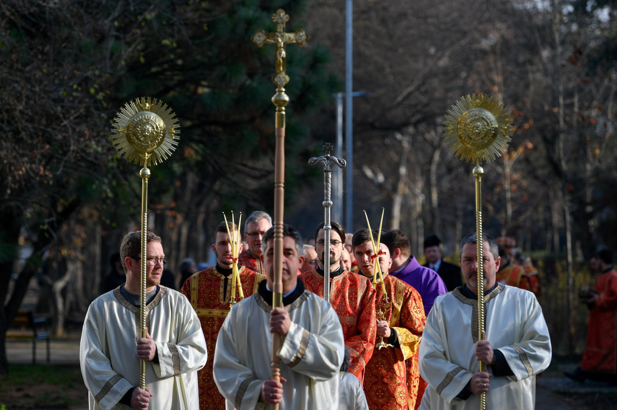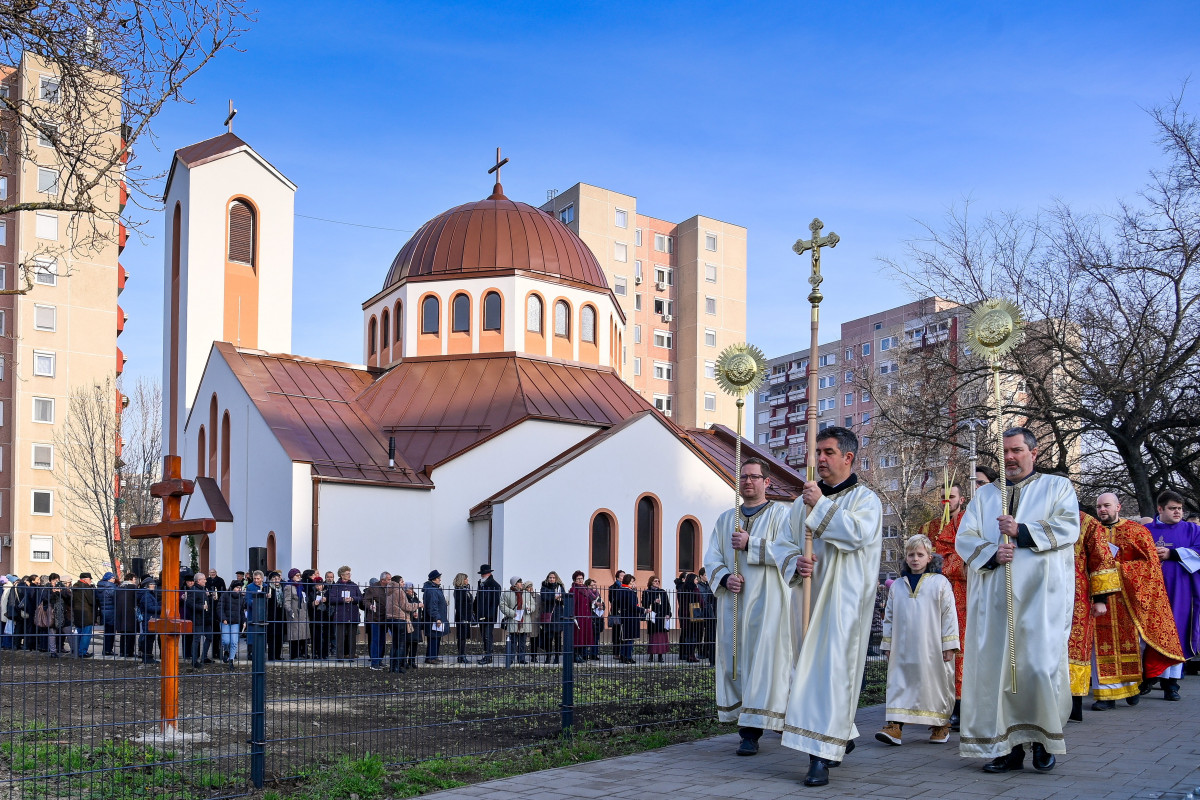 Körmenettel tisztelegtek a hívek a 300 millió forintból épített Szentháromság görögkatolikus templom felszentelése előtt Debrecenben.
