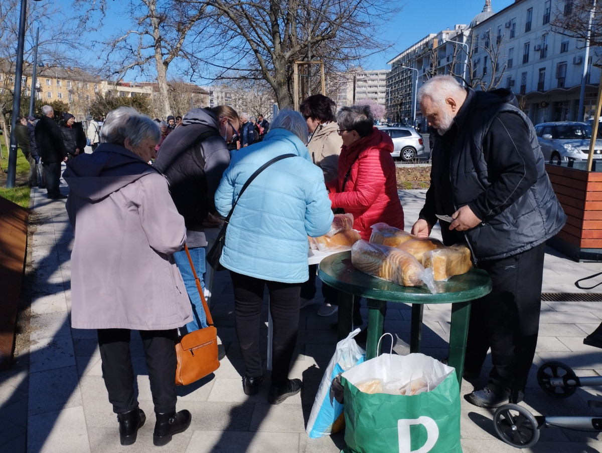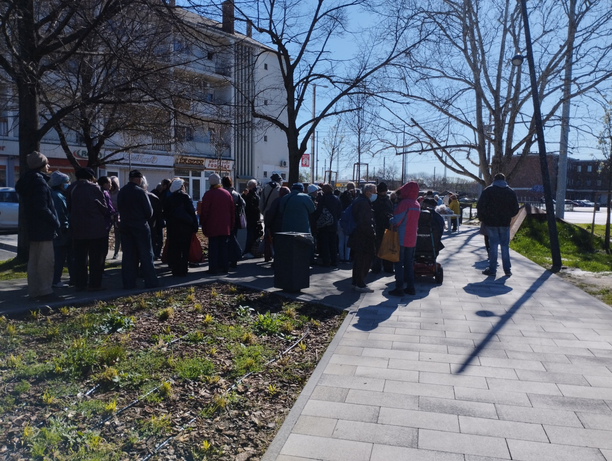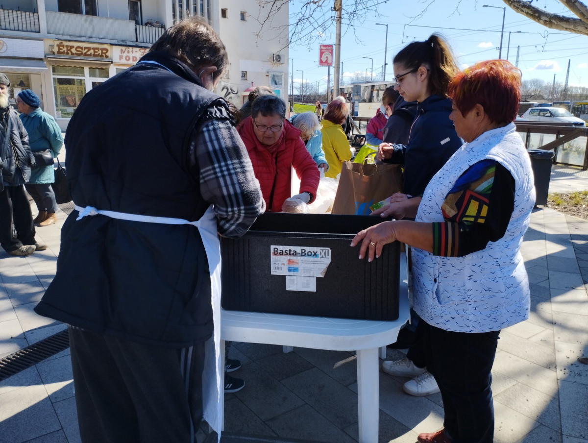 Már jóval az ételosztás kezdete előtt gyülekeztek az ételre várók. Zömmel kisnyugdíjasok, de jöttek olyanok is, akik életét a Holdról is látható óriási infláció roppantotta meg. Vendégeink többsége – elmondásuk szerint – jóval havi 120 ezer forint alatti nyugdíjból próbál nem éhen halni.